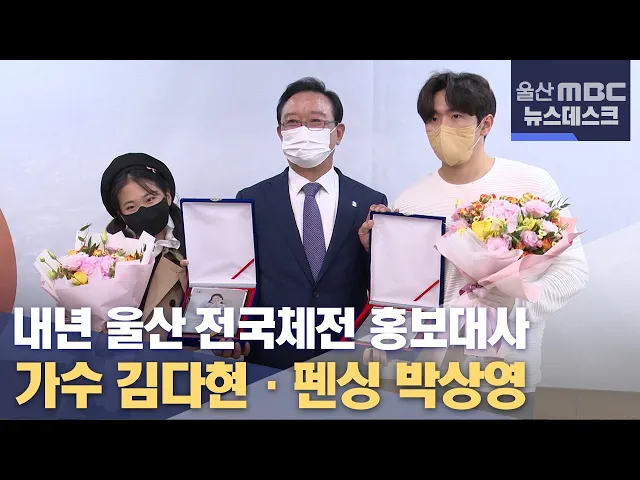 내년에 울산에서 개최되는 전국체전의 홍보대사로 가수 김다현과 펜싱 선수 박상영이 위촉됐습니다. 김다현은 최근 방송사 경연대회에서 3위를 차지하는 등 인기를 얻고 있으며 박상영은 울산시청 펜싱팀 소속으로 2016년 리우 올림픽에서 금메달, 올해 도쿄올림픽에서 단체전 동메달을 땄습니다. 이들은 전국체전 관련 행...