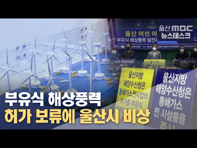 ◀ANC▶울산시의 최대 역점사업인 부유식 해상풍력 사업이 산업통상자원부의 허가 보류 결정으로 제동이 걸렸습니다.해상 시위를 벌이고 있는 어민 갈등을 해결하지 못했다는 이유 때문인데, 울산시의 고민이 깊어지고 있습니다.정인곤 기자.◀END▶◀VCR▶울산 앞바다에서 58킬로미터 떨어진 동해바다.바다 위에는 바람...