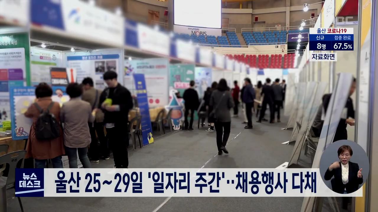 울산시가 오늘(10/25)부터 29일까지 '2021년 일자리 주간'으로 정하고 채용 행사를 마련합니다. 26일과 27일 동천체육관에서는 60개 기업이 참가하는 '울산 일자리 박람회'와 함께 릴레이 강연이 열립니다. 오는 29일까지는 울산 가족문화센터에서 청년들을 위한 토크 콘서트, 진로 상담 프로그램을 포함한 '울산 청년 일자...
