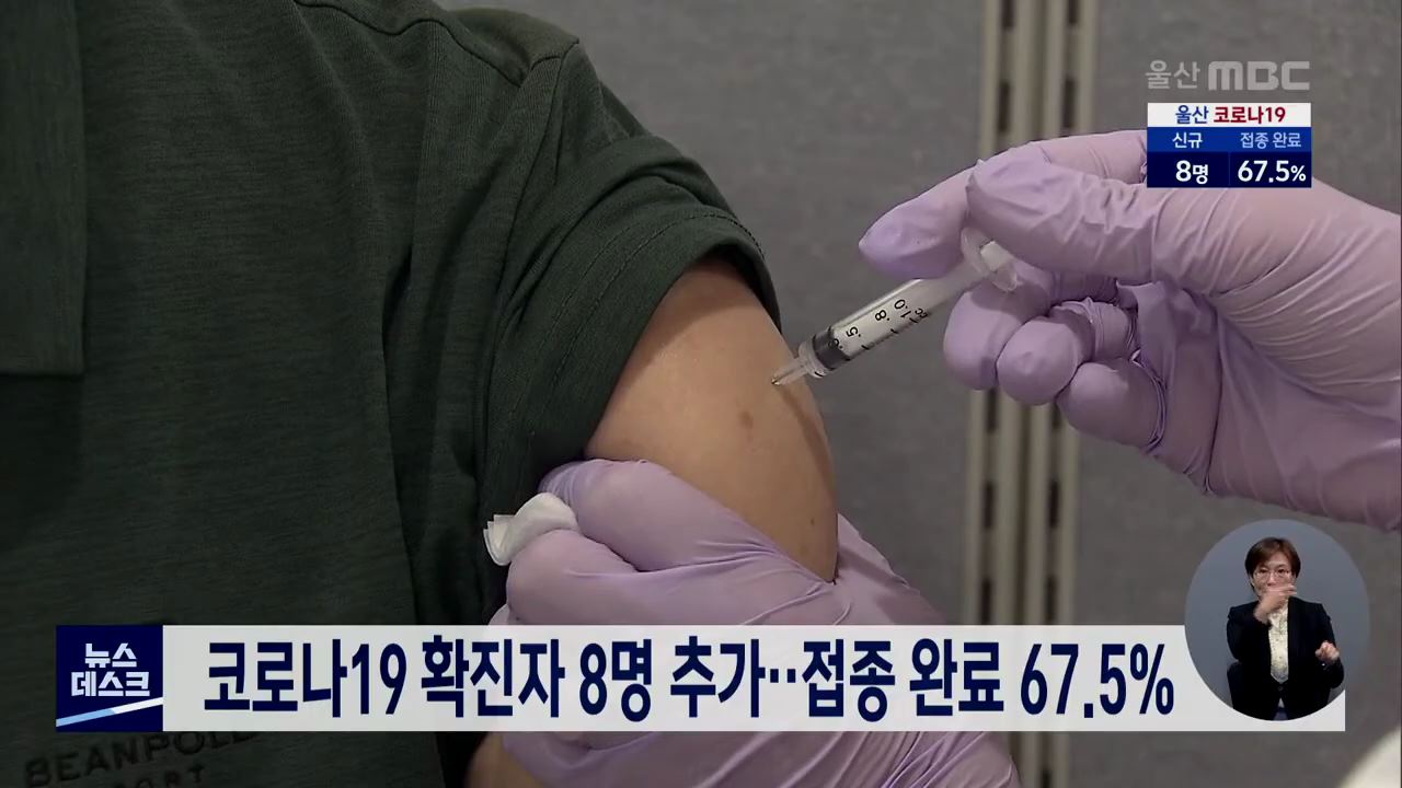 오늘(10/25) 울산에서 확진자 8명이 추가로 나왔습니다. 이들 중 2명은 서울과 인천 확진자와 접촉해 감염된 것으로 파악됐습니다. 오늘 오후 5시 기준, 1차 접종을 마친 울산 시민은 인구 대비 77.3%이며 접종 완료자는 67.5%까지 늘었습니다.