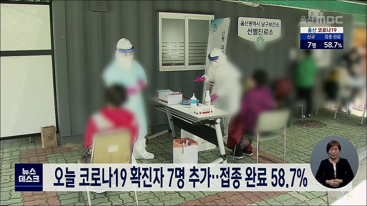 오늘(10/12) 울산에서는 코로나19 확진환자 7명이 추가로 나왔습니다. 이 가운데 5명은 기존 확진자와 접촉한 것으로 확인됐으며 나머지 두 명은 감염 경로를 조사하고 있습니다. 한편, 오늘(10/12) 오후 5시 기준 1차 접종을 마친 사람은 인구 대비 76.2%이며, 접종 완료자는 58.7%로 집계됐습니다.