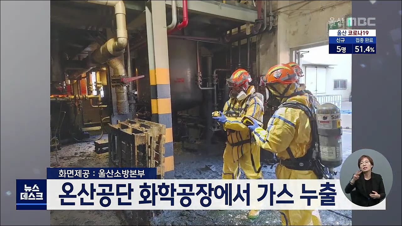 오늘(10/5) 오후 4시 20분쯤 울주군 온산읍 화산리의 한 화학공장 농약제조동에서 연기가 다량으로 발생해 인근 주민들의 신고가 잇따랐습니다. 소방당국은 공장에서 생산된 반제품에서 증기가 응축해 만들어진 가스인 흄 1천3백킬로 가량이 외부로 누출된 것으로 보고 정확한 가스 성분을 조사하고 있습니다. //
