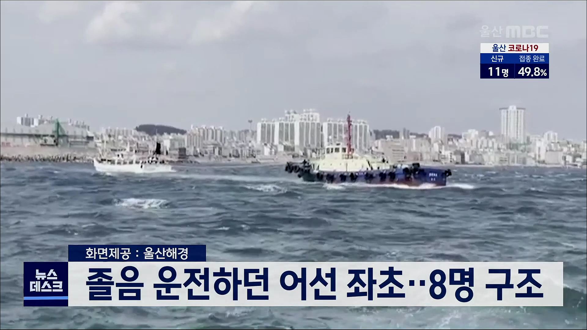오늘(10/4) 오전 9시 20분쯤 (울산광역시) 동구 방어진항 인근 바다에서 조업을 마치고 입항하던 50톤급 어선이 테트라포트에 부딪쳐 좌초됐습니다. 신고를 받고 출동한 해경은 배에 타고 있던 선원 8명을 구조하고 기름 유출에 대비해 오일펜스를 설치했습니다. 해경은 졸음 운전을 했다는 선장의 말에 따라 정확한 사고 ...
