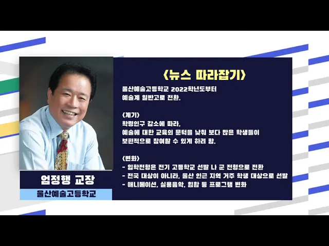 예술고등학교 일반고로 전환… 예술 분야 무상 교육 가능해져 보다 실용적이고 내실있는 교육 기대 기존 학생들은 학비 혜택이 없어, 갈등의 여지 방송 : 울산MBC 라디오 김연경의 퇴근길 톡톡 표준FM 97.5(18:10~19:00) 진행 : 김연경 앵커 대담 : 엄정행 울산예술고등학교 날짜 : 2021년 7월 7일울산 유일의 중등 예술 교...