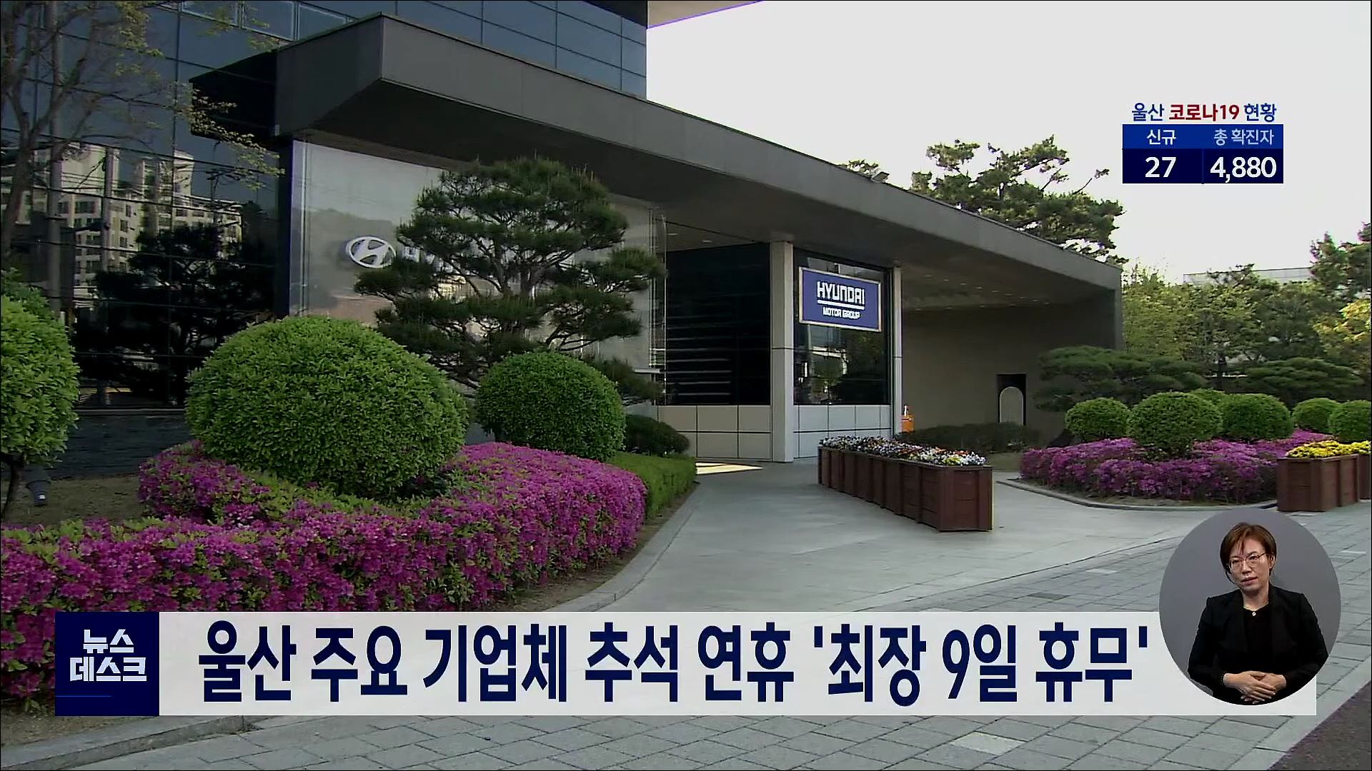 울산지역 주요 기업체들이 내일(9/18)부터 최장 9일 동안 추석 연휴에 들어갑니다. 현대중공업과 현대자동차는 노사 합의에 따라 휴일을 포함해 오는 26일까지 9일간 휴무한다고 밝혔습니다. 또 현대미포조선은 23일까지 6일간 추석 연휴를 보내기로 했습니다. 한편 석유화학업계는 이번 연휴에도 24시간 공정 특성상 정상 ...