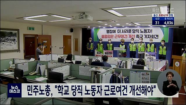 민주노총 공공운수노조 전국교육공무직본부 울산지부가 오늘(9/15) 울산시교육청 프레스센터에서 기자회견을 열고 학교 당직 노동자들의 근로여건 개선을 촉구했습니다. 노조는 학교 당직 노동자들이 하루 평균 16~24시간 동안 일하지만 6~8시간 밖에 인정받지 못한다며 근무 인정 시간을 늘려야 한다고 주장했습니다. 이에...