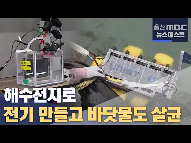 ◀ANC▶바닷물이 닿으면 전기를 방출하는 '해수전지'는울산과학기술원이 세계 최초로 개발한 기술인데요.이 기술을 활용한 바닷물 살균·중화 설비가 새롭게 만들어졌습니다. 양식장과 선박 평형수 살균 등 쓰임새가 무궁무진하다는 평가를 받고 있습니다. 이용주 기자입니다. ◀END▶ ◀VCR▶바닷물에 잠겨 있는 '해수...