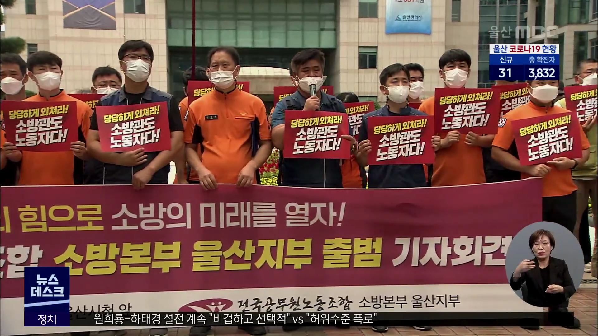 전국공무원노동조합 소방본부 울산지부가 오늘(8/19) 울산시청 앞에서 노조 출범 기자회견을 가졌습니다. 이들은 재난현장에서 국민의 생명과 재산을 지키는 노동자로서 앞으로 정당한 지위와 권리를 요구하겠다고 주장했습니다. 공무원노조 소방본부 울산지부에는 전체 대상 1천200명 가운데 682명이 가입했으며, 초대 지...
