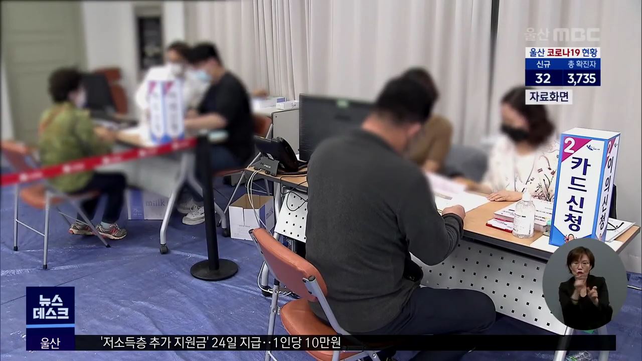 코로나19로 생계가 어려워진 저소득층을 위한 추가 국민지원금이 오는 24일 지급됩니다. 이 지원금은 전 국민 88%를 대상으로 하는 5차 재난지원금과 별도로 보건복지부 계획에 따라 1인당 10만원씩 지급됩니다. 울산지역 대상자는 기초생활보장수급자, 차상위 계층, 양육비 지원 한부모 가족 등 4만7천여 명으로 현금 급여...