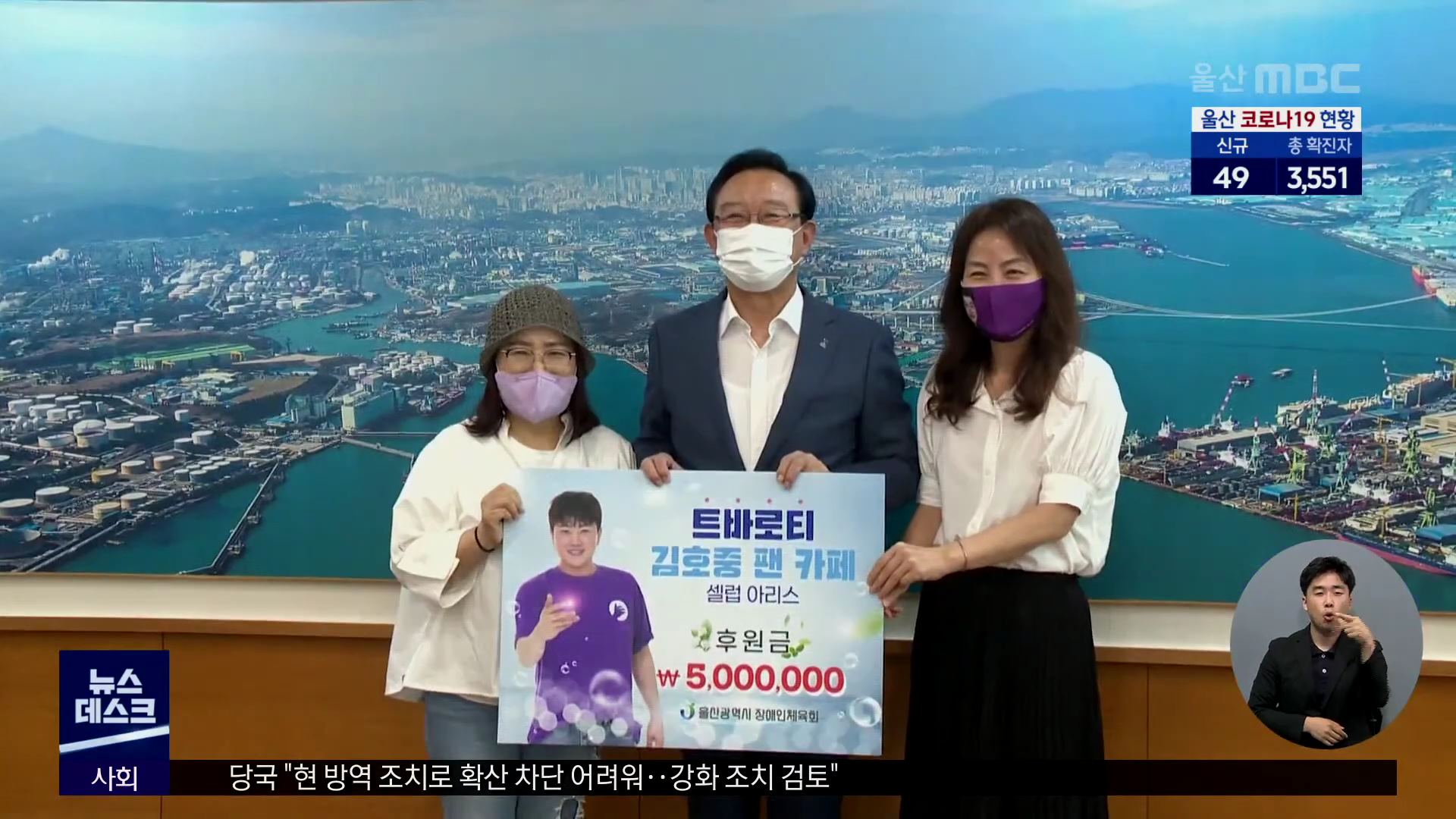 울산 출신 가수 김호중 팬카페는 오늘(8/11) 시청을 찾아 장애인체육 발전을 위한 후원금 500만 원을 전달했습니다. 울산광역시장애인체육회는 후원받은 금액을 오는 10월 열리는 제41회 전국장애인체육대회에 출전하는 울산시 선수를 위해 사용할 계획입니다. //