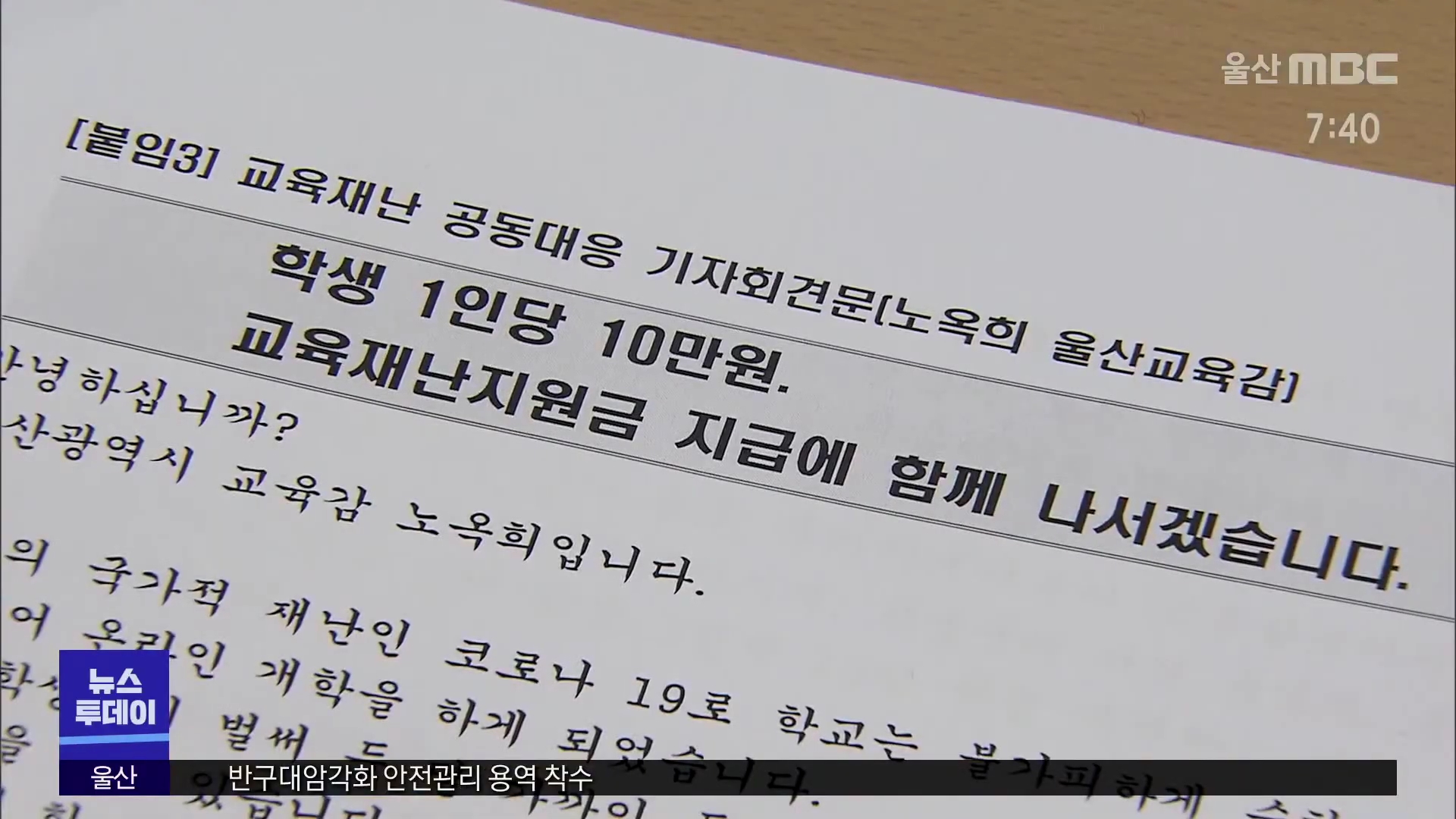 울산시교육청이 3차 교육재난지원금 지급을 검토하고 있다고 밝혔습니다. 시교육청은 구체적인 지원금액을 확정하면 2차 추경에 반영해 오는 9월 스쿨뱅킹을 통해 학부모에게 지급할 예정입니다. 시교육청은 앞서 전국 최초로 교육재난지원금을 유·초·중·고 학생 1인당 10만 원씩 두 차례에 걸쳐 지급했습니다.//