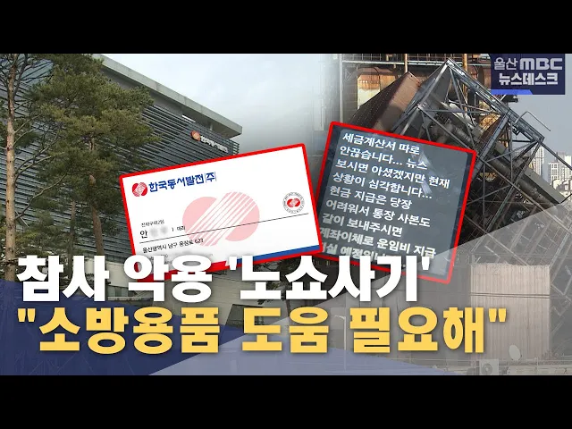 [앵커]이렇게 절박한 화력발전소 붕괴사고의 상황을 악용한 사기 행각이 최근 울산을 중심으로 잇따르고 있습니다. 사고 현장에 소방용품이 필요하다며 도움을 요청하면서 돈을 가로채는 이른바 '노쇼 사기'와 수법이 비슷해 경찰이 주의를 당부했습니다. 이다은 기자 입니다. [리포트]화물 트럭으로 배송일을 하는 박 모 ...