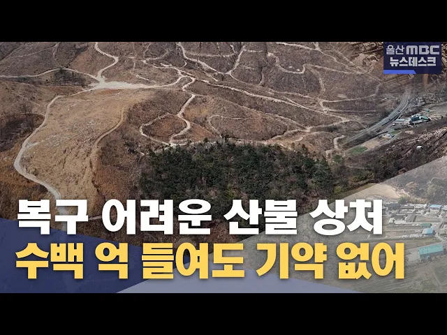 [ 앵 커 ]울산에서 발생한 대형 산불은 다행히 인명피해를 남기진 않았지만, 푸른 숲에 또 한 번 깊은 상처를 남겼습니다. 이렇게 산불이 발생하면 다시 숲을 가꾸는데 수백억 원이 들지만, 돈을 쏟아부어도 시간이 흘러도 상처는 쉽게 아물지 않습니다. 정인곤 기자입니다.[ 리포트 ]마을 입구부터 주택이 모두 산불에 타...