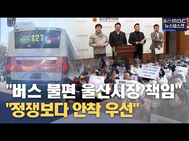 [앵커]시내버스 노선 개편 논란이 석 달이 다 되도록 끊이지 않고 있습니다. 진보 야권과 시민들은 시청에서 항의 집회를 열고 울산시장의 책임이라고 주장했는데요. 국민의힘 소속 시의원들은 버스 개편이 정치적 갈등으로 번져서는 안 된다고 반박했습니다. 최지호 기자. [리포트](Effect) "버스 노선 전면 수정하라!" 시...