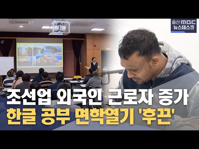 [앵커]국내 청년층의 조선업 기피 현상으로 동구에 유입되는 외국인 근로자들이 갈수록 늘어나고 있습니다. 이런 외국인 근로자들을 위해 지자체가 한글 교육을 시작했는데, 예상외로 수강생이 몰리면서 면학열기가 뜨겁다고 합니다. 이다은 기자입니다. [리포트]휴일을 맞아 외국인 근로자들이 삼삼오오 모여 한국어 수업...