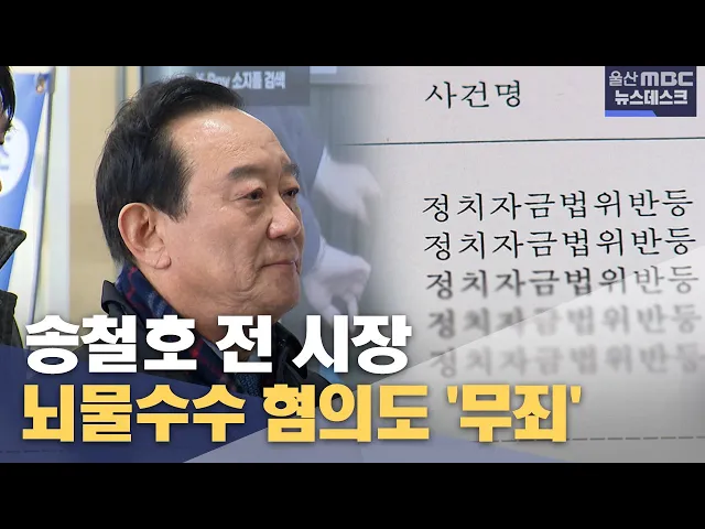 [ 앵 커 ]최근 '울산시장 선거개입 의혹' 사건 항소심에서 무죄를 선고받은 송철호 전 울산시장이 '뇌물수수 혐의'도 일단 벗게 됐습니다. 오늘 울산지법에서 열린 1심 선고 공판에서 무죄를 선고받은 건데요. 하지만 함께 기소된 측근들은 줄줄이 실형을 선고받았습니다. 이용주 기자. [ 리포트 ]두 가지 재판을 동시에 받...