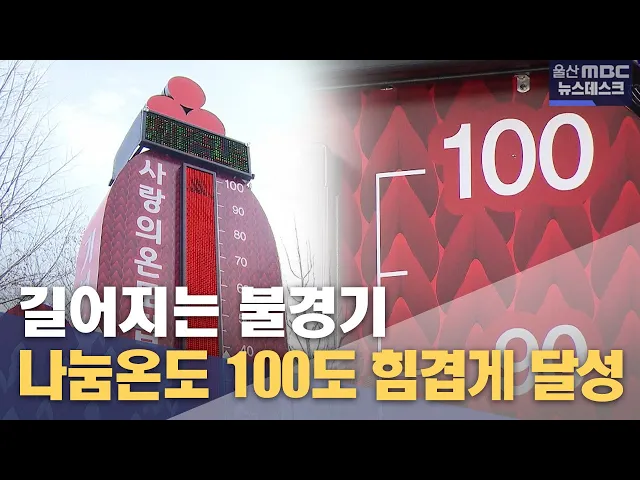 [앵커]울산 사랑의 온도탑이 모금 마지막 날인 오늘(1/31) 100도를 가까스로 넘어섰습니다. 모금액을 지난해보다 1억 원 낮췄지만, 길어지는 불경기에 힘겹게 목표 모금액을 달성했습니다. 정인곤 기자 [리포트]사랑의 온도탑 나눔온도가 100.4도를 기록했습니다. 설 명절을 지나 모금 마지막 날이 돼서야 목표 모금액을 달...