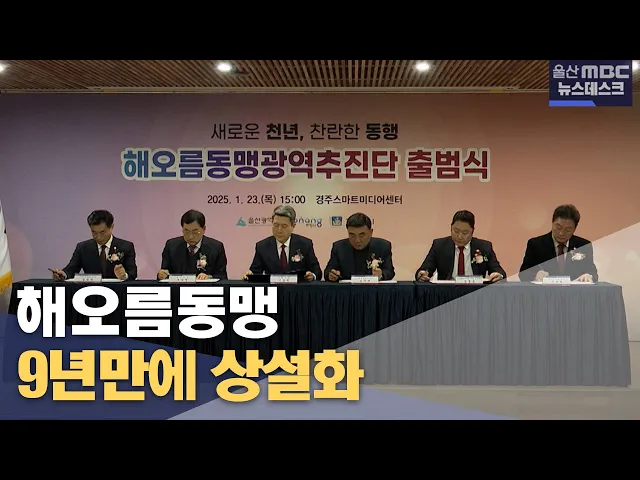 [ 앵 커 ]울산과 포항, 경주시가 참여하는 해오름동맹이 결성된 지 9년 만에 상설 기구로 확대 개편됐습니다. 세 도시는 수도권 집중화에 따른 지역소멸과 산업위기를 함께 극복하기 위해 해오름산업벨트지원법 통과에도 힘을 쏟기로 했습니다. 홍상순 기잡니다. [ 리포트 ]해오름동맹 광역추진단이 출범했습니다. 추진단 ...