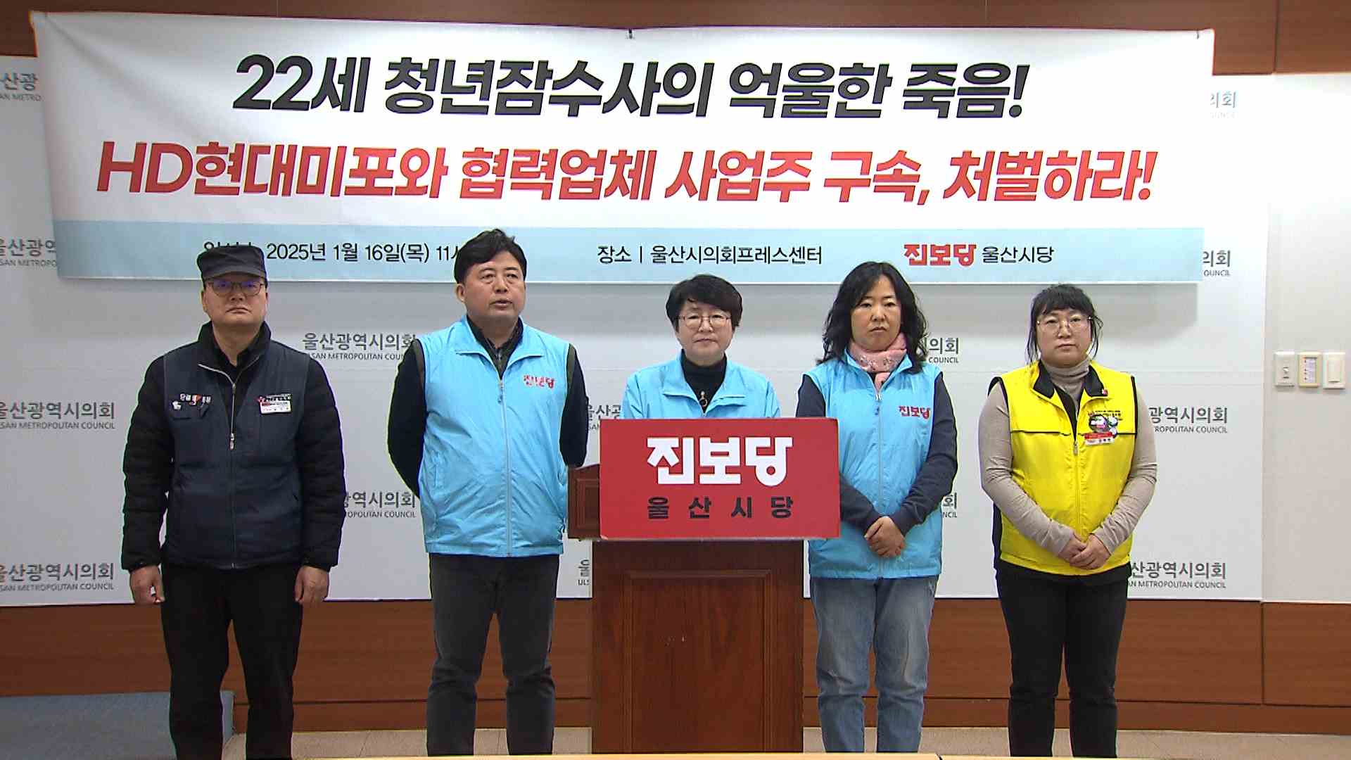 진보당 울산시당은 오늘(1/16) 기자회견을 열고 지난달 HD현대미포에서 발생한 청년 잠수사의 작업 중 사망사고에 대한 책임자 엄중 처벌을 촉구했습니다. 이들은 울산해경과 부산고용청이 사고 당일 무리한 잠수 작업이 없었는지 진상을 규명해야 한다며, 원하청 사업주를 중대재해기업 처벌법에 따라 구속 수사하라고 요...
