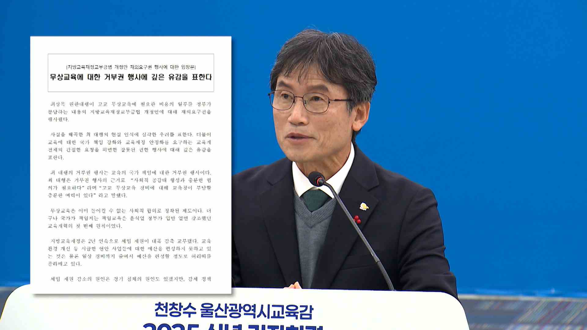 최상목 대통령 권한대행이 고등학교 무상교육 국비지원 연장에 거부권을 행사한 것과 관련해 천창수 울산교육감이 유감을 표명했습니다. 천 교육감은 입장문을 내고 이번 결정은 교육의 국가 책임에 대한 거부라며 피해는 결국 학생과 학부모들이 입게 될 것이라고 우려했습니다.최 권한대행은 오늘(1/14) 오전 고교 무상교...