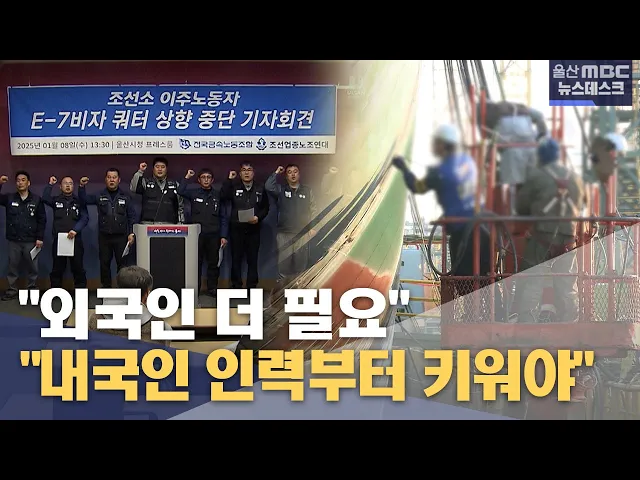 [앵 커] 심각한 조선업계 인력난 새호를 위해 외국인 노동자 비중을 늘리는 방안이 마련되고 있습니다. 울산형 광역비자 도입도 이런 맥락인데요. 이렇게 되자 조선업 노동자들이 오히려 내국인들이 설 자리가 줄어든다며 반발하고 있습니다. 홍상순 기잡니다. [리포트] HD현대중공업 협력업체는 190여개. 이들 업체의 외국...