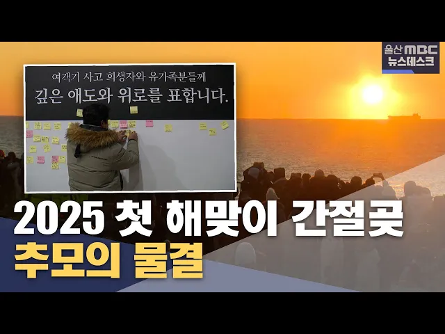 [앵커]2025년 1월 1일 첫날 한반도에서 해가 가장 먼저 뜨는 울산 간절곶에 새해가 힘차게 떠올랐습니다. 제주항공 여객기 참사로 국가 애도 기간이 이어지는 가운데 간절곶에서도 차분하게 해맞이가 치러졌습니다. 이다은 기자입니다. [리포트]오전 7시 31분. 구름 한점 없이 선명한 수평선 위로 새해 첫 아침을 밝히는 붉...