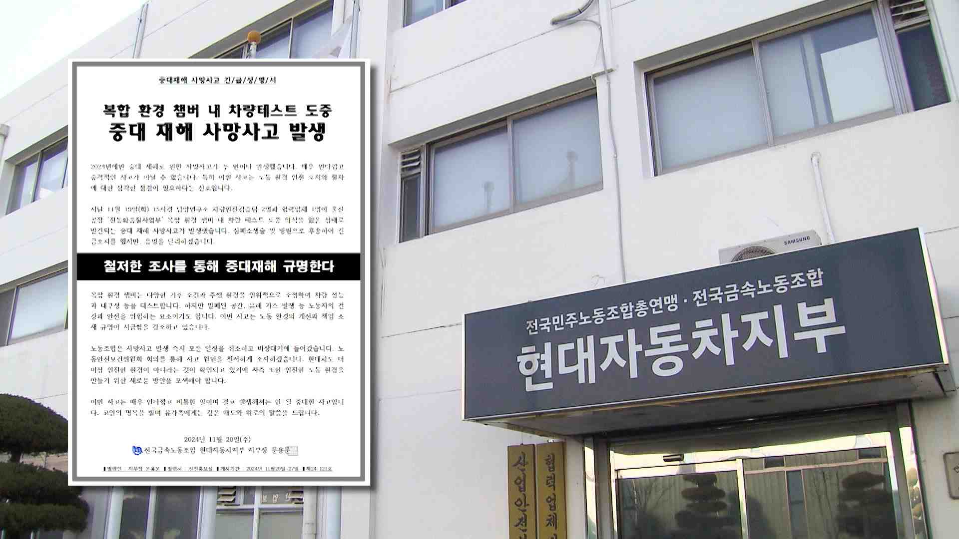 연구원 3명이 숨진 사고와 관련해 현대자동차 노동조합이 노동 환경 개선과 책임 소재 규명이 시급하다고 밝혔습니다. 노조는 철저한 조사와 함께 현대차도 더 이상 안전한 환경이 아니라는 것이 확인됐다며 사측이 노동 환경 개선에 나설 것을 요구했습니다. 현대차도 이동석 대표이사 사장이 담화문을 내고 안전의 중요성...