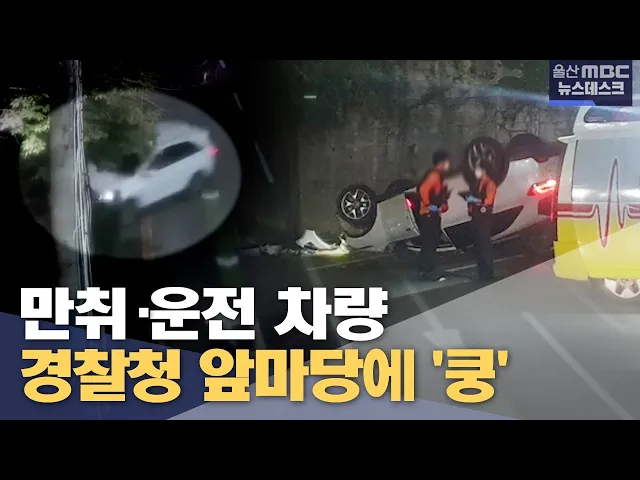 ◀ 앵 커 ▶ 어젯밤 울산에서 만취 운전자가 몰던 차량이 도로 옆 4미터 아래 주차장으로 추락하는 사고가 벌어졌습니다. 그런데 이 차량이 떨어진 곳이 하필 경찰들이 가장 많이 모여있는 울산경찰청이었습니다. 사고를 내고 행패까지 부리던 운전자는 현장에서 바로 입건됐습니다. 최지호 기자. ◀ 리포트 ▶ 거꾸로 뒤집힌 ...