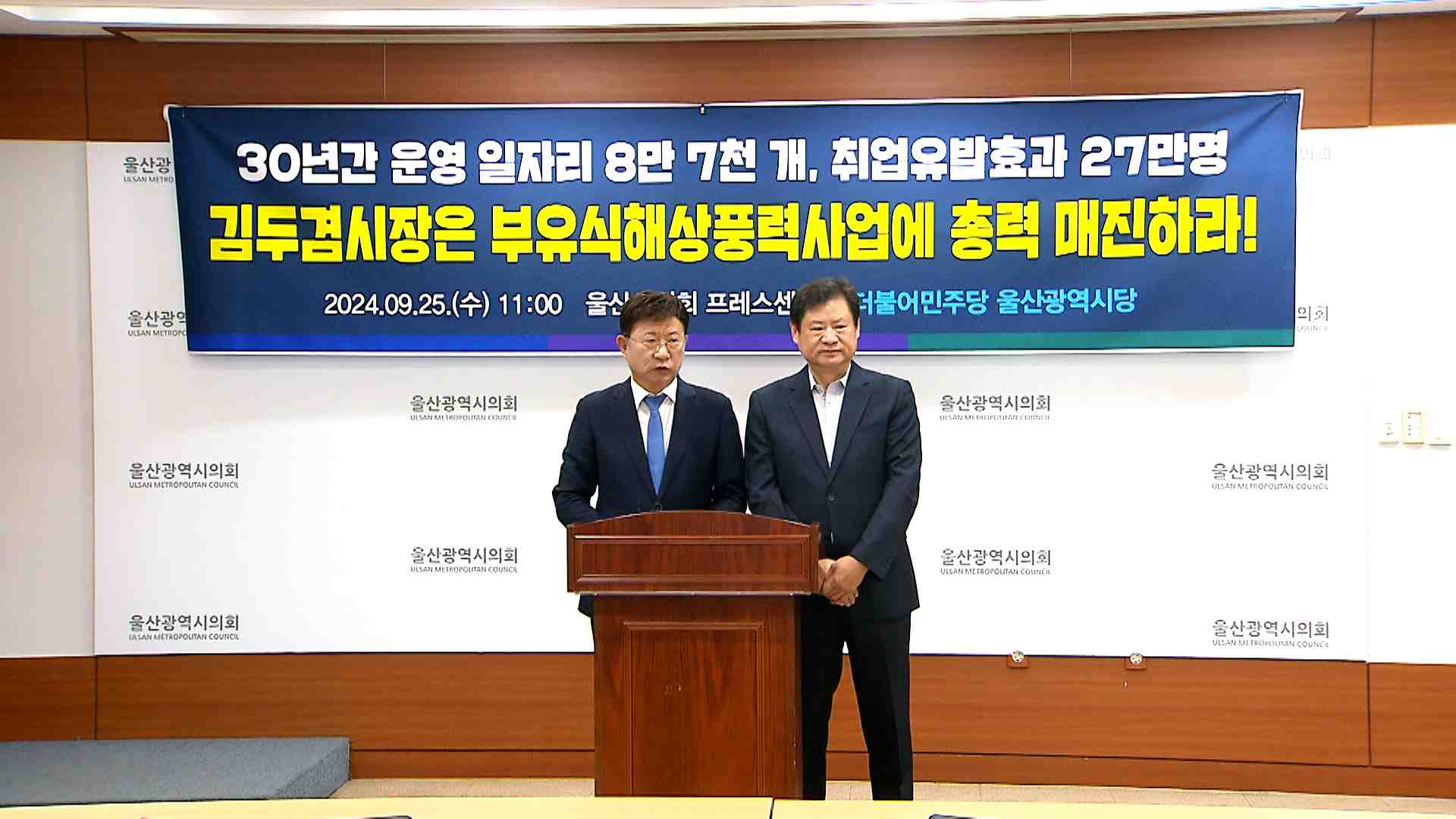 더불어민주당 울산시당은 오늘(9/25) 시의회 프레스센터에서 기자회견을 열고 김두겸 울산시장에게 중단 없는 부유식 해상풍력 사업 추진을 촉구했습니다. 민주당은 울산 부유식 해상풍력 사업이 엄격한 환경부의 승인을 받아 100억원이 투입되는 사업임을 강조하며 울산시의 정책적 행정적 지원을 요구했습니다.