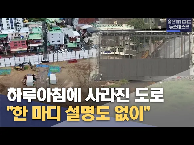 [앵커]주민들이 수십 년 동안 사용해온 도로가 아파트 공사 현장에 포함되며 갑자기 사라져 버렸습니다.길이 막힐 때까지 주민들은 단 한 번의 설명도 없었다며 분통을 터트리고 있는데 행정기관들은 절차상 문제가 없다는 말만 반복하고 있습니다. 정인곤 기자 [리포트]울산 남구의 한 아파트 신축 공사현장.공사현장을 둘...