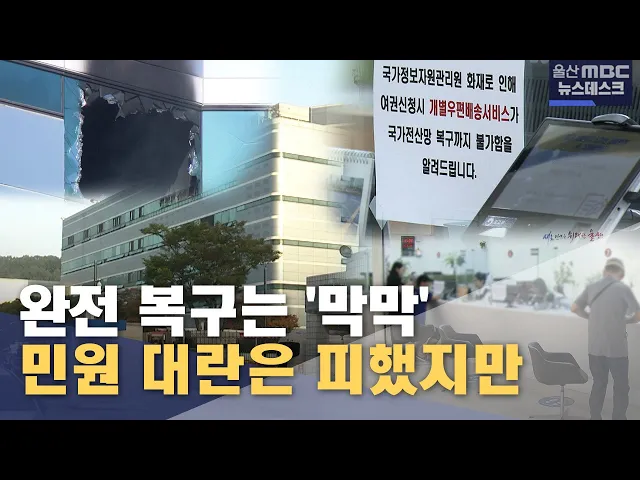 [앵커]국가정보자원관리원 화재 여파로 지자체 행정 시스템도 나흘째(닷새째) 차질을 빚고 있습니다. 평일이 되면서 우려됐던 민원 대란은 피했지만 일부 온라인 서비스는 여전히 접속 장애 상태인데요. 완전 복구까지는 최소 2주가 걸릴 것으로 보입니다. 최지호 기자. [리포트]울산시청 종합민원실. 신규 여권을 신청하는...