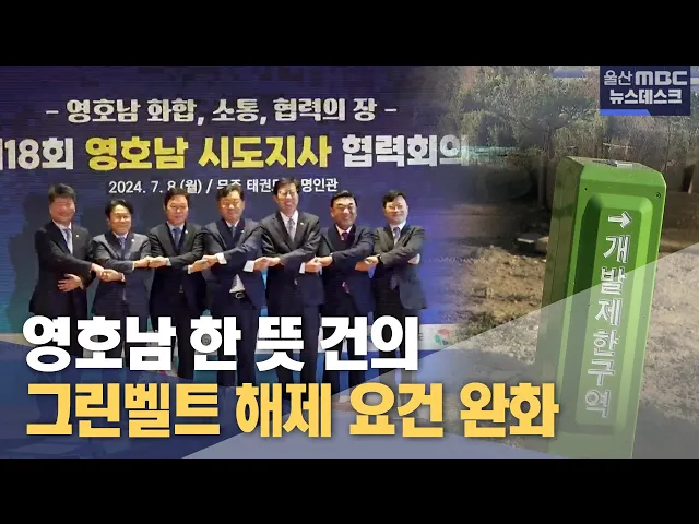 [앵 커] 오늘(7/8) 영호남 8개 시도지사 회의에서 대정부 성명서가 체결됐습니다. 성명서에는 울산시가 줄곧 요구해온 그린벨트 해제 요건 완화와 울산-전주간 고속철도, 울산-양산간 고속도로 건설 등이 담겼습니다. 조창래 기자가 보도합니다. [리포트] 영남과 호남의 8개 시도지사가 모두 한 자리에 모였습니다. 지방분...