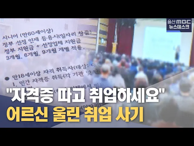 [앵커]노인 일자리를 미끼로 수억 원을 받아 가로챈 일당이 경찰에 붙잡혔습니다.소정의 교육비를 내고 자격증을 따면 국비로 모두 돌려받고 취업도 할 수 있다는 말에 3천 명이 넘는 어르신들이 속아 넘어갔습니다. 최지호 기자. [리포트]지난해 울산에서 열린 시니어인턴십 설명회에 참석한 70대 남성.만 65세 이상이면 3...