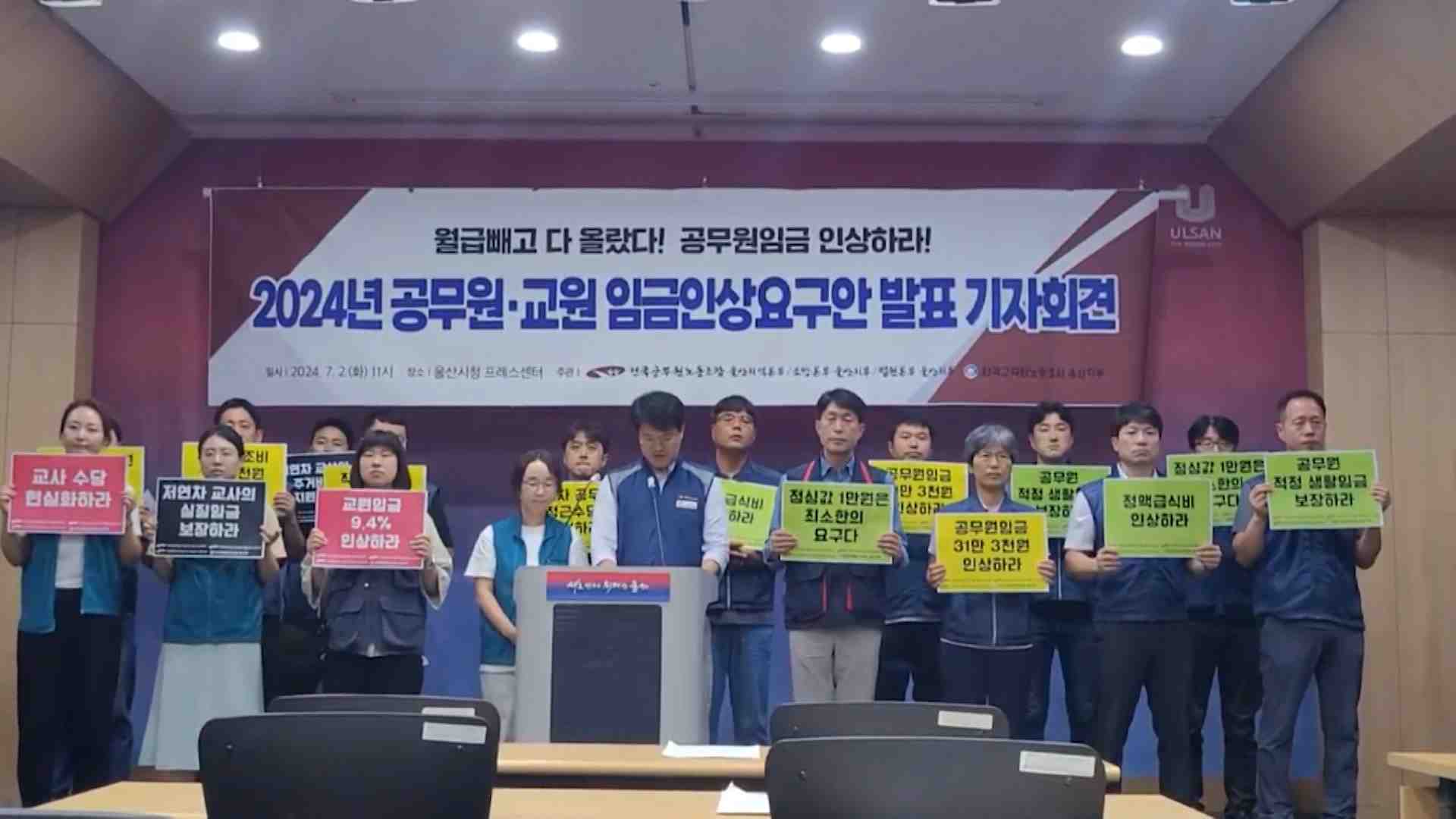 전국공무원노조 울산본부와 전국교직원노조 울산지부가 함께 기자회견을 열고 임금 인상을 요구했습니다. 두 노조가 올해 임금협상 공동 대응에 나선 가운데 공무원노조는 임금 8.1% 인상안을 전교조는 9.4% 인상안을 각각 발표했습니다. 이들은 현실적인 인건비 상승을 요구하며 열악한 인건비 수준이 하위직 공무원 퇴직...