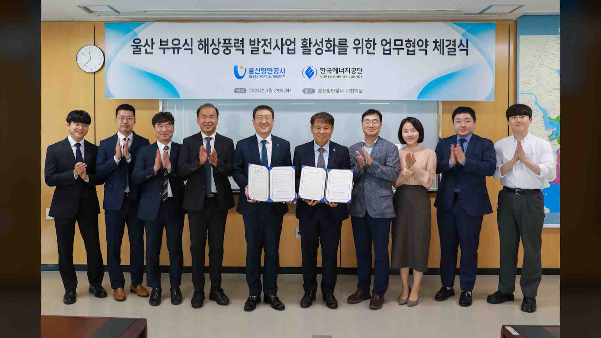 울산항만공사는 오늘(5/28) 한국 에너지공단과 울산 부유식 해상풍력 지원 인프라 활성화를 위한 업무협약을 체결했습니다. 이번 협약은 현재 울산 앞바다에 추진중인 연간 6기가 와트급의 부유식 해상풍력 발전사업 성공을 위해 체결됐으며, 양 기관은 해상풍력 생태계 조성과 각종 지원정책 개발에 협력하기로 했습니다.