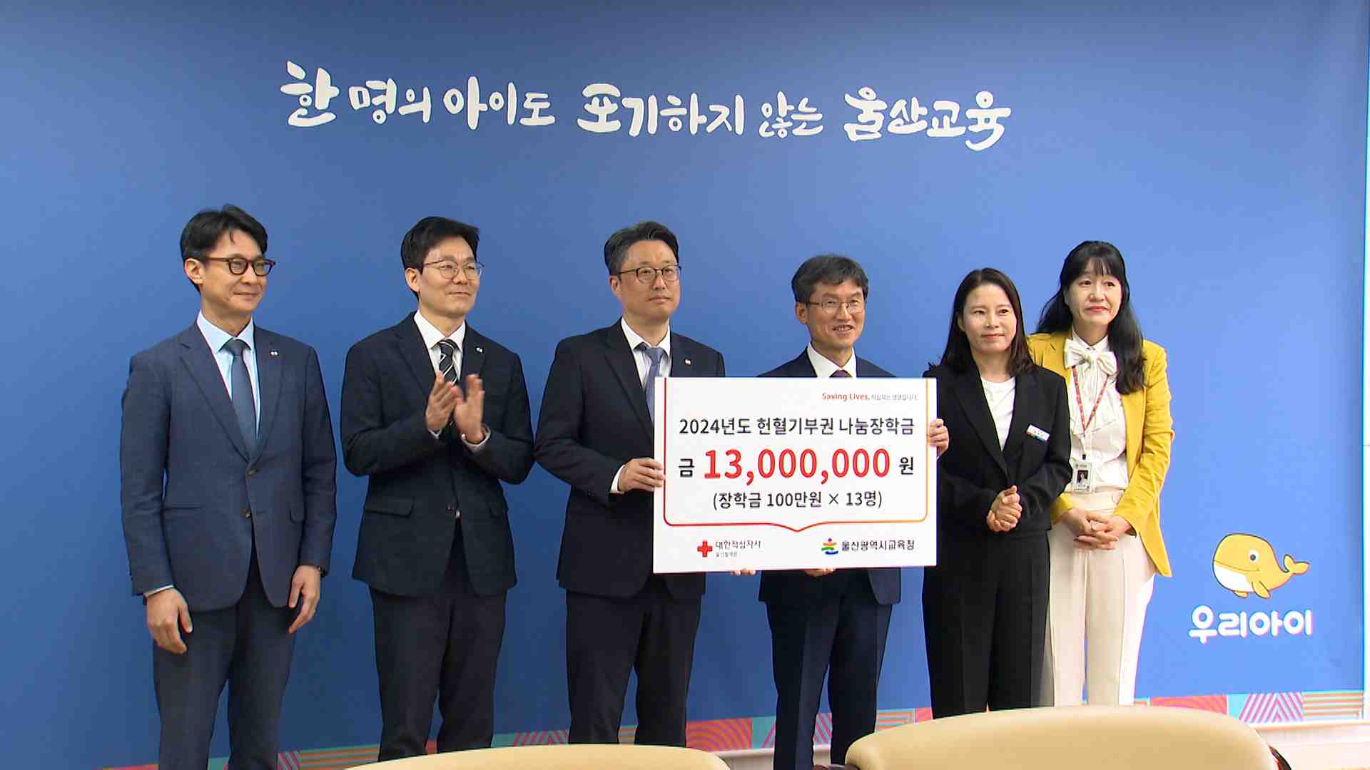 대한적십자사 울산혈액원이 오늘(5/16) 울산시교육청에 헌혈기부금 나눔장학금 천300만원을 전달했습니다. 헌혈기부금 나눔장학사업은 헌혈자가 헌혈후 기념품을 받지 않고 그 금액만큼 기부된 기금으로 학생들에게 장학금을 주는 사업입니다. 교육청은 경제적으로 어려운 생활 여건에도 학교생활에 충실한 고등학생 13명을...