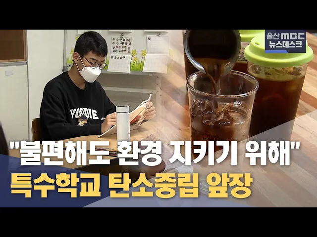 [앵커]울산의 한 특수학교가 기후위기에 대응하기 위해 일상 생활에서 탄소배출 줄이기를 실천하고 있습니다.한번 쓰고 버리는 1회용 컵이나 종이 타올은 이 학교에서 사라졌는데요, 여러모로 불편하지만 지구 환경을 지키기 위해 노력하고 있는 장애 학생들을, 홍상순 기자가 만났습니다. [리포트]울산의 한 특수학교, 바...