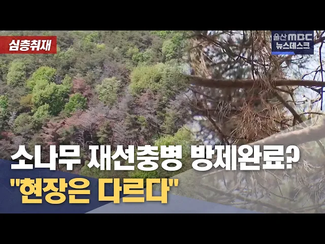 [앵커]한동안 주춤했던 소나무재선충병이 울산지역에 급속도로 확산하고 있습니다.울산MBC는 재선충병 실태와 대응책을 찾아보는 연속 기획을 준비했습니다. 각 지자체가 많은 예산을 들여 방제 작업을 펼치고 있지만, 역부족입니다. 이다은 기자가 방제 현장을 둘러봤습니다. [리포트]소나무숲 곳곳이 붉게 물들어 말라 죽...