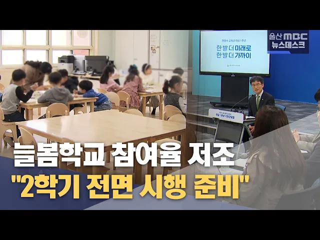 ◀ 앵 커 ▶ 늘봄학교가 2학기 때부터 전면 시행되지만 울산의 늘봄학교 참여학교 비율은 아주 저조한 것으로 나타났습니다. 보궐선거로 당선된 천창수 울산교육감은 취임 1주년 기자회견에서 늘봄학교 전면시행에 지장이 없도록 하겠다고 강조했습니다. 홍상순 기잡니다. ◀ 리포트 ▶ 현재 울산지역 늘봄 참여율은 20%. 전국 ...