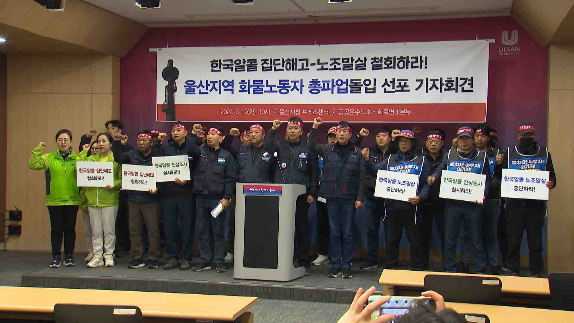 민주노총 공공운수노조는 오늘(3/19) 기자회견을 열고 한국알콜산업이 조합원 해고 계획을 철회하지 않으면 오는 21일부터 화물연대 총파업에 들어가겠다고 밝혔습니다. 노조는 성실 교섭을 약속받고 농성을 해제했지만 경찰 수사에 이어 조합원 전체 해고로 이어지고 있다며 진상조사를 요구했습니다. 한편 경찰은 지난달 ...