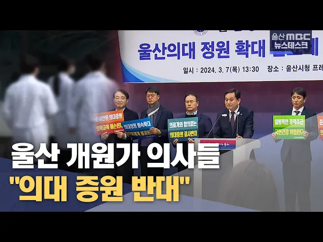 [앵 커]울산의 개업 의사들이 정부의 의사 증원 정책에 대해 처음으로 입장을 드러냈습니다.울산에 의사가 부족하다는 점은 인정하면서도, 단순히 의대 정원을 늘려서는 울산의 의료 환경을 개선할 수 없다며 정부 정책에 반대 입장을 분명히 했습니다.유희정 기자.[리포트]지난 2022년 기준으로 울산에서 활동하는 의사는 ...