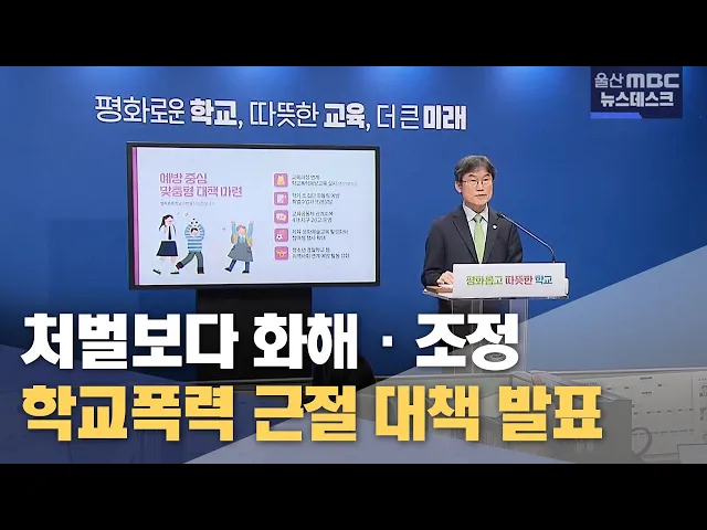 새학기를 맞아 천창수 울산교육감이 오늘(3/5) 기자회견을 갖고 학교 폭력 근절을 위해 예방 중심의 맞춤형 대책을 추진하겠다고 밝혔습니다.천 교육감은 모든 학교에서 교육과정과 연계해 연간 11차시 이상 학교폭력 예방교육을 진행하고 학교폭력이 발생하면, 빠른 화해와 조정으로, 더 큰 분쟁으로 확산되지 않도록 힘쓰...