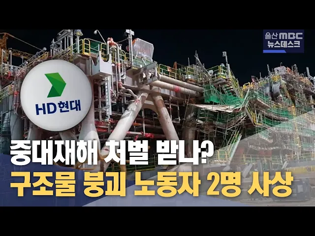 [앵 커]설 연휴 마지막날인 어제(2/12) HD현대중공업 울산조선소 해양공장에서 근로자 1명이 사망하고 1명이 중상을 입는 사고가 발생했습니다.고용노동부는 사고가 발생한 HD 현대중공업 공정에 작업 중지 명령을 내리고 중대재해처벌법 위반 여부를 조사하고 있습니다.이다은 기자.[리포트]거대한 철제 구조물이 한쪽으로...