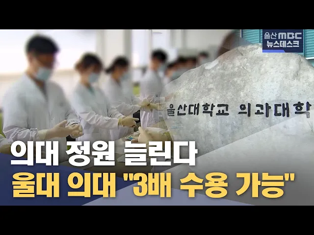 ◀ 앵 커 ▶ 정부가 2025학년도 입시부터 의대 정원을 2천명 늘리기로 했습니다. 각 대학의 구체적인 배정 인원은 추후 발표하기로 했는데 울산대는 현재 40명인 정원의 3배까지 수용 가능하다는 입장을 내놨습니다. 홍상순 기자가 보도합니다. ◀ 리포트 ▶ 3천58명으로 묶여있던 의대 정원이 19년만에 5천58명으로 늘어납니다...