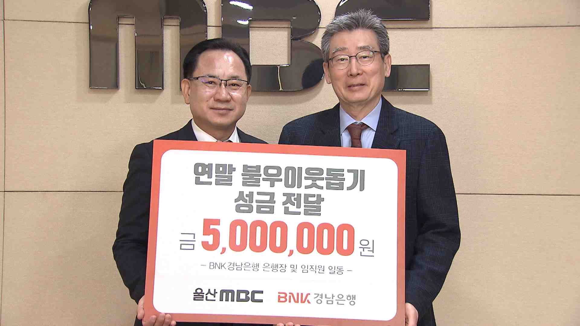 BNK경남은행 울산영업본부는 오늘(12/20) 울산MBC를 방문해 희망 2023 나눔캠페인 성금 5백만 원을 기부했습니다. 이 성금은 울산사회복지공동모금회에 전달돼 울산의 어려운 저소득층을 위한 각종 지원사업에 사용될 예정입니다.