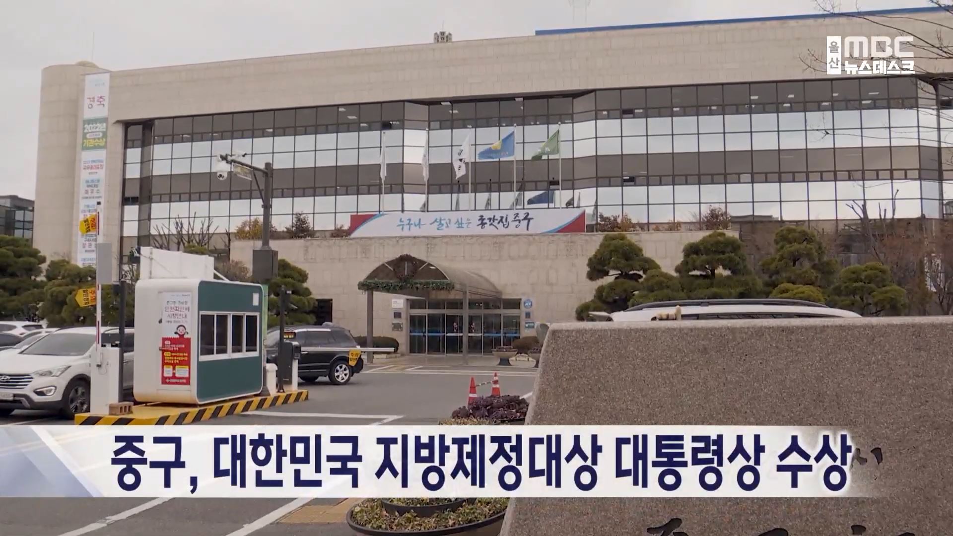중구가 대한민국 지방제정대상에서 우수기관으로 선정돼 대통령상과 상금 10억 원을 수여받았습니다.행안부는 올해 지자체의 지방재정 우수사례 182건을 심사해 우수사례 33건을 선정했습니다.행정안전부는 환경개선부담금 고지서에 QR코드를 삽입해 주민이 편리하게 환경개선부담금을 납부할 수 있도록 한 중구의 정책이 ...