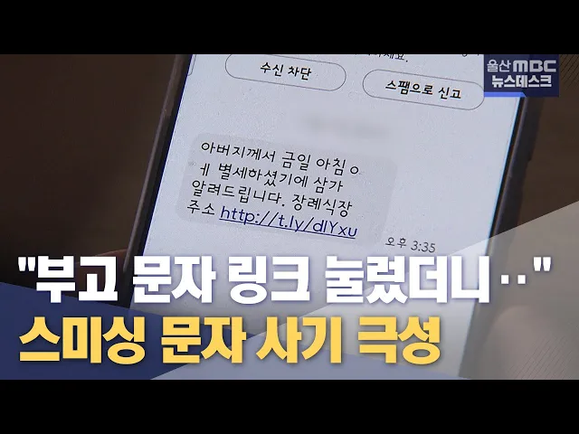 ◀ 앵 커 ▶ 링크를 첨부한 가짜 문자 메시지를 보내 소액 결제를 유도하는 '스미싱' 문자를 조심하셔야겠습니다. 특히 지인의 전화번호로 부고장을 받으면 의심하기 쉽지 않은데, 사기 유형도 다양해지고 있습니다. 이다은 기자. ◀ 리포트 ▶ 울산의 한 구청 직원인 김 모씨가 동료 직원들에게 보낸 부친 부고 문자 메시지. ...