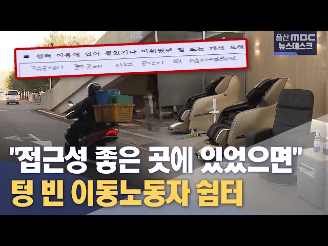 [앵커]최근 택배, 대리운전기사 등 이동노동자들이 늘어나면서 이들이 쉴 수 있는 쉼터가 만들어지고 있습니다.수억 원을 들여 괜찮은 시설을 만들어놨지만 이용자는 손을 꼽을 정도로 적습니다. 이유는 무엇인지, 이다은 기자가 취재했습니다. [리포트]울산 북구의 한 상가 건물.지난 9월 문을 연 이동노동자 쉼터가 자리 ...