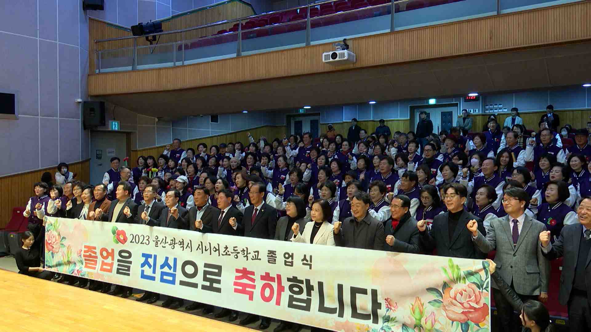 울산 시니어초등학교 제1기 졸업식이 오늘(12/5) 울산가족문화센터 대강당에서 열렸습니다.제1기 졸업생은 울산에 거주하는 55세 이상의 시민 128명으로 올해 3월 7일 입학해 11월 30일까지 1, 2학기 과정을 모두 수료했습니다.이날 졸업식에서는 황종철 학생회장과 서재우, 최경자 졸업생 3명에게는 울산시장상이, 김만수 ...