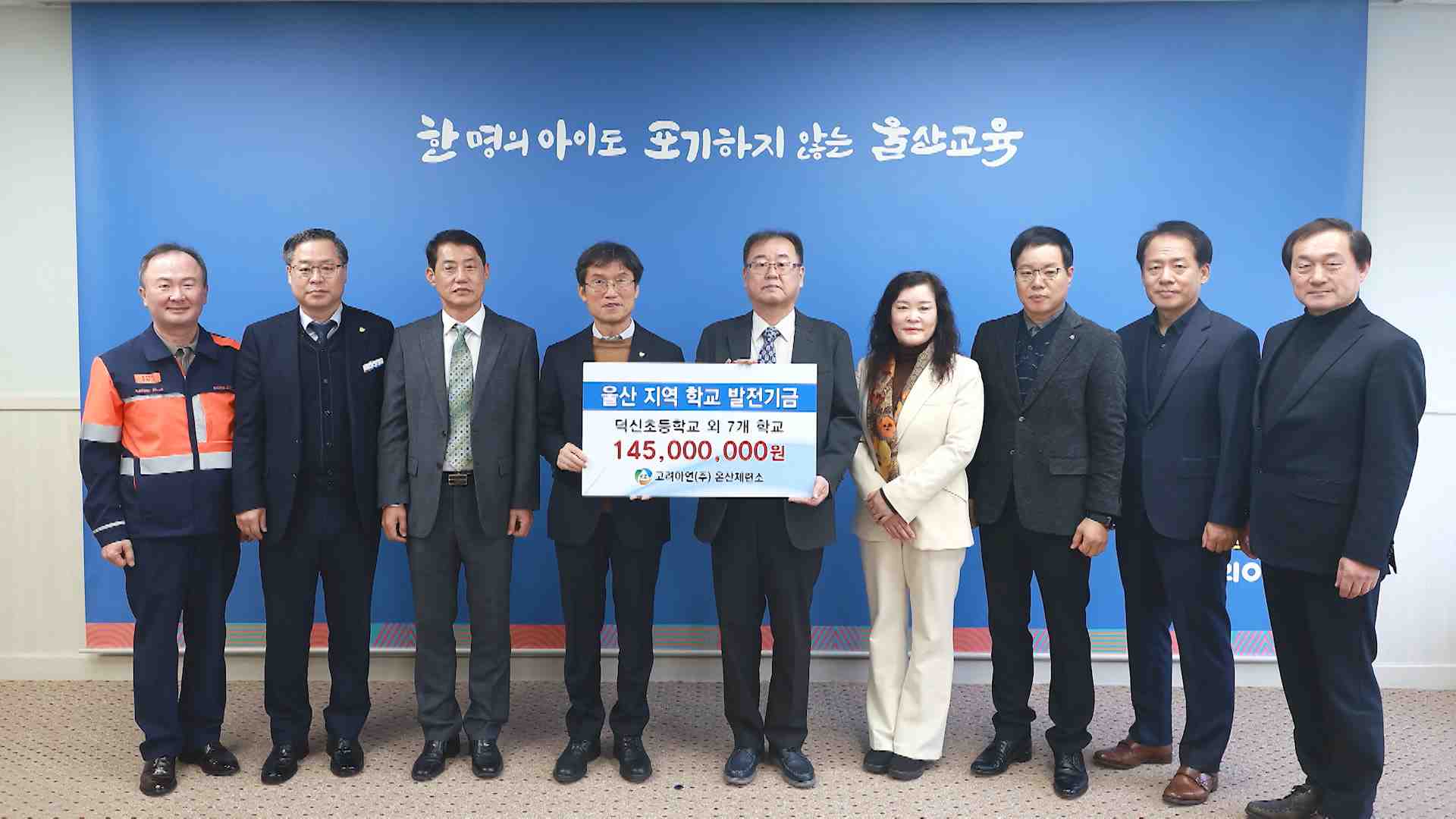 고려아연 온산제련소가 울산시교육청을 찾아 학교발전기금으로 총 1억4천500만원을 기부했습니다.기금은 울주군 온산읍과 온양읍에 있는 초중고등학교 7곳과 언양읍에 있는 울산행복학교에 500만원에서 최대 3천만원이 전달됩니다.고려아연은 16년동안 학교발전기금으로 15억5천500만원을 기탁했습니다.